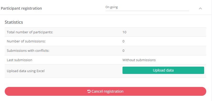 Enter the data into an Excel file. On the main menu (left side), click on Upload data (green button) → Create template. The template will be generated and available in Downloads → Excel template for uploading registration form data.